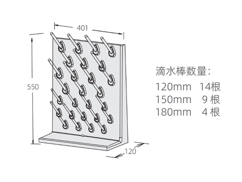 SAN-8101B · 材质:高强度PP新料,耐腐蚀,不易老化 · 常用于中央台的两端和边台墙壁上,多用于晾挂试管烧杯等器皿 · 创新的锁紧结构,稳定性强,防止实验器材掉落破损 · 可选择120mm、150mm、180mm三种长度的滴水棒,适配不同尺寸和形状的器皿