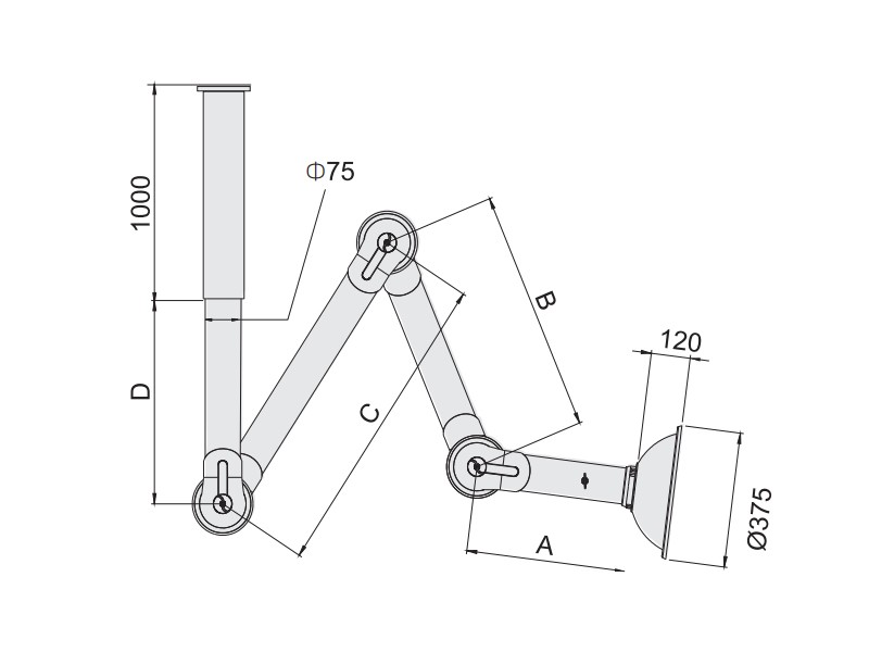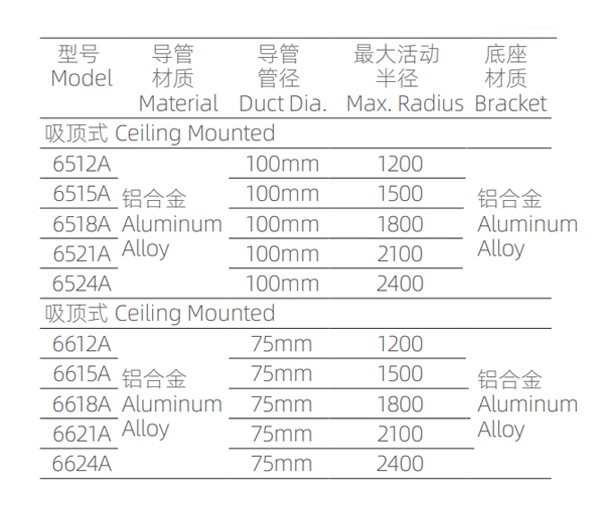 SAN-65XXA/66XXA · 底座:PVC材质 · 主体:铝合金材质 · 关节:PP材质 · 最大活动半径:1200mm/1500mm/1800mm/2100mm/2400mm · 关节密封圈:高密度橡胶材质 · 风门组件:聚丙烯(PP)+丁腈橡胶(NBR) · 罩口:直径φ375mm,PP 材质(红色、白色、半透明)、PC 材质(全透明)