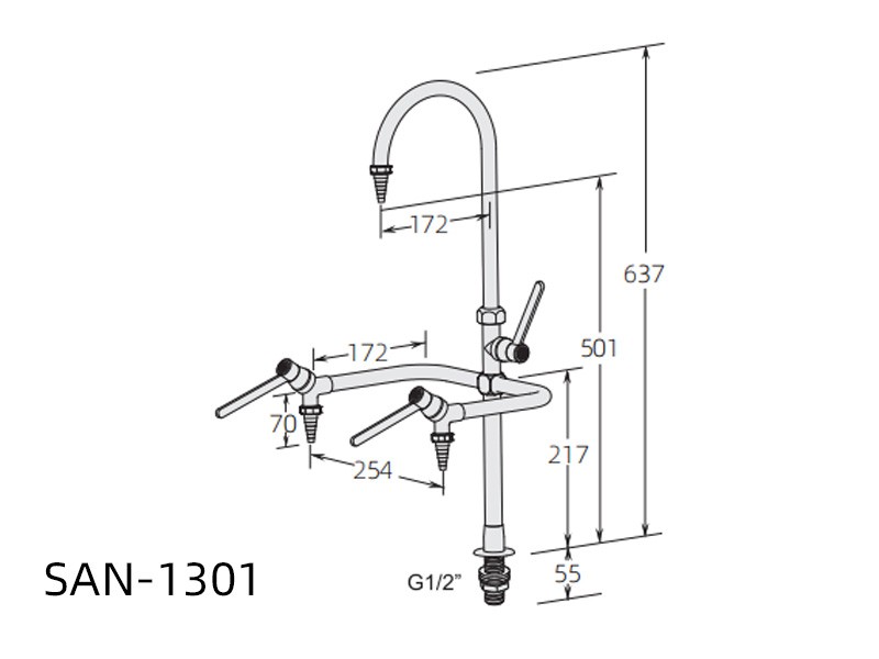 SAN-1301/1311 · 肘动开关使用方便,避免双手直接接触,防止二次污染 · 主体:优质铜材 · 涂层:高亮度环氧树脂涂层,耐腐蚀,防紫外线辐射 · 阀体:陶瓷阀芯 · 水嘴:可拆卸,材质可选铜质或 PP